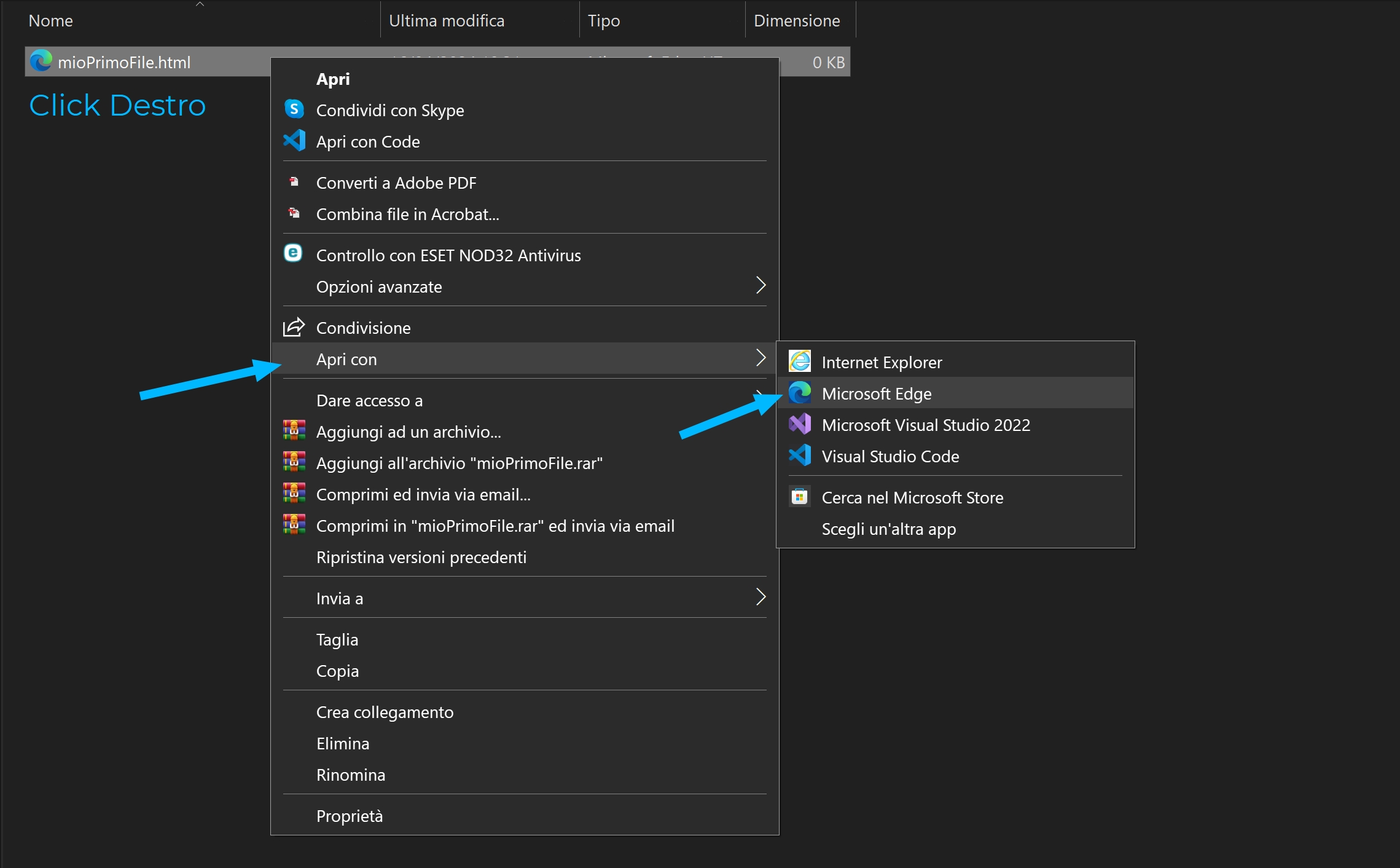 Salva il file dentro una cartella del tuo pc e successivamente aprilo con il tuo browser preferito (Edge, Google Chrome, ecc...) per vedere la tua prima pagina web!